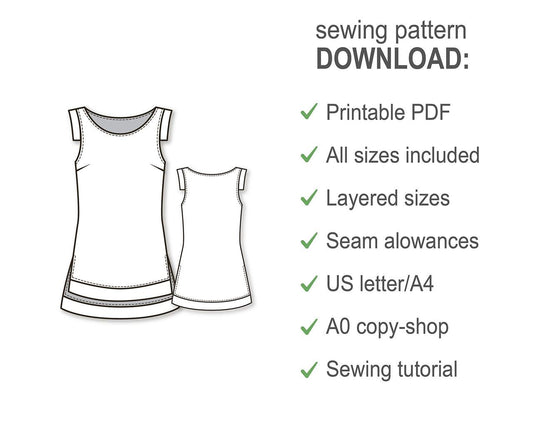 Collarless cap sleeve woven top/blouse with round neckline and high-low hem - Easy to sew PDF sewing pattern for women