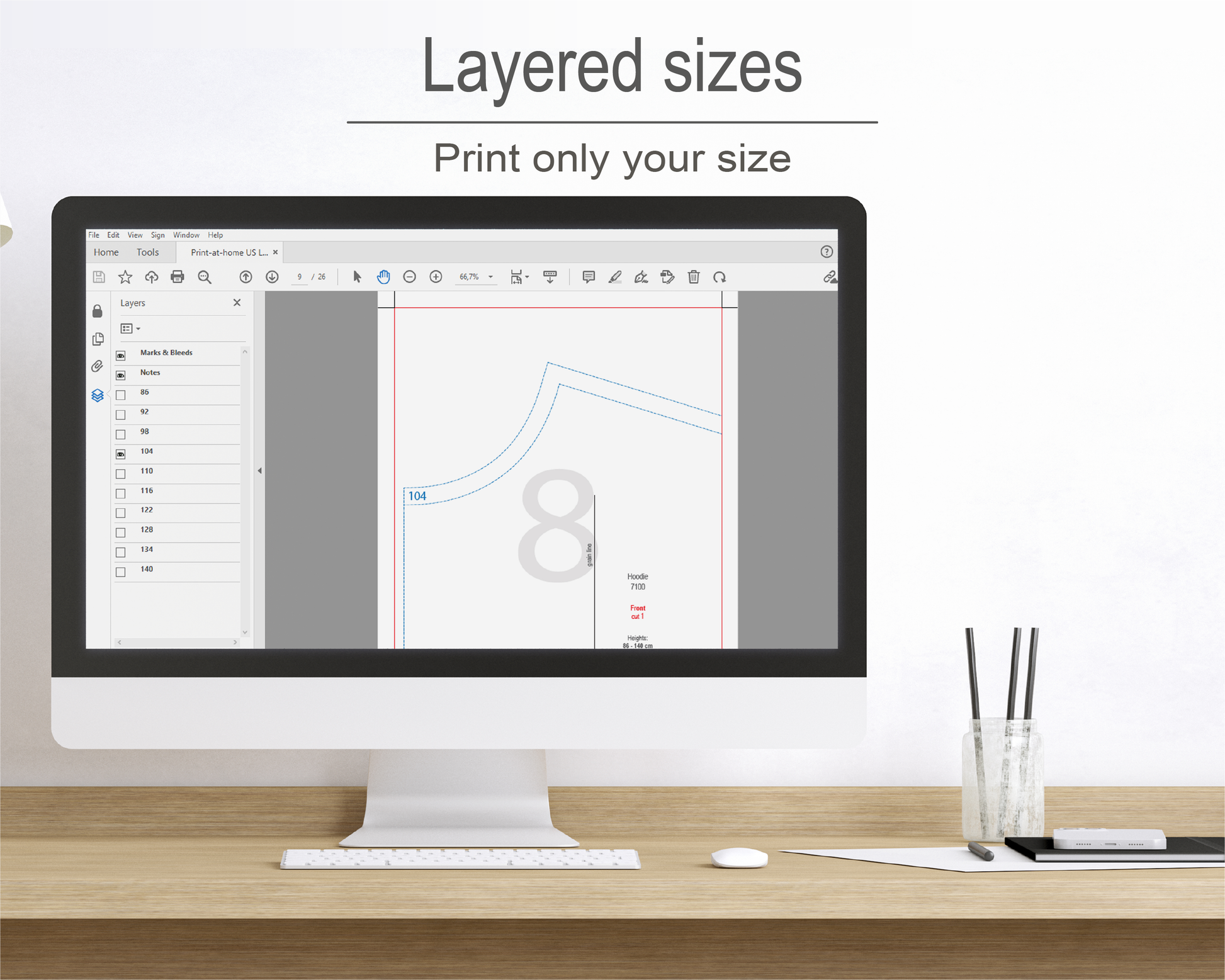 1. Printable LAYERED PDF sewing pattern of all sizes and heights WITH SEAM ALLOWANCES (can be optionally cut out). US letter/A4 print-at-home format and a large scale A0 copy-shop format.