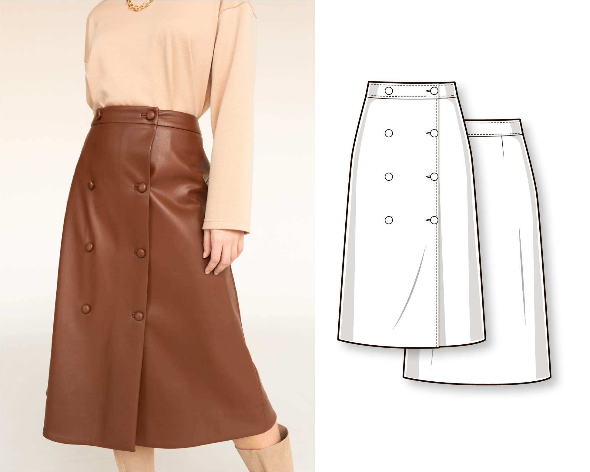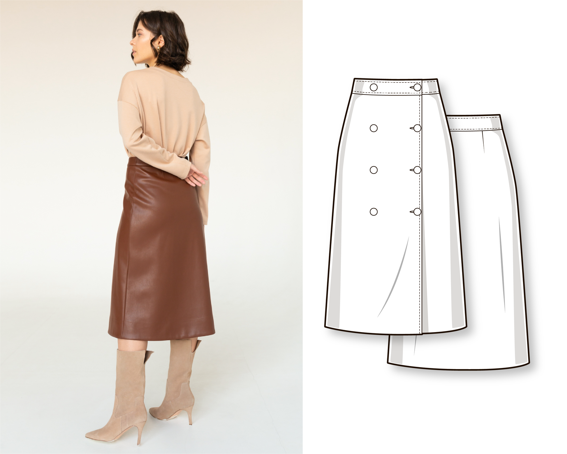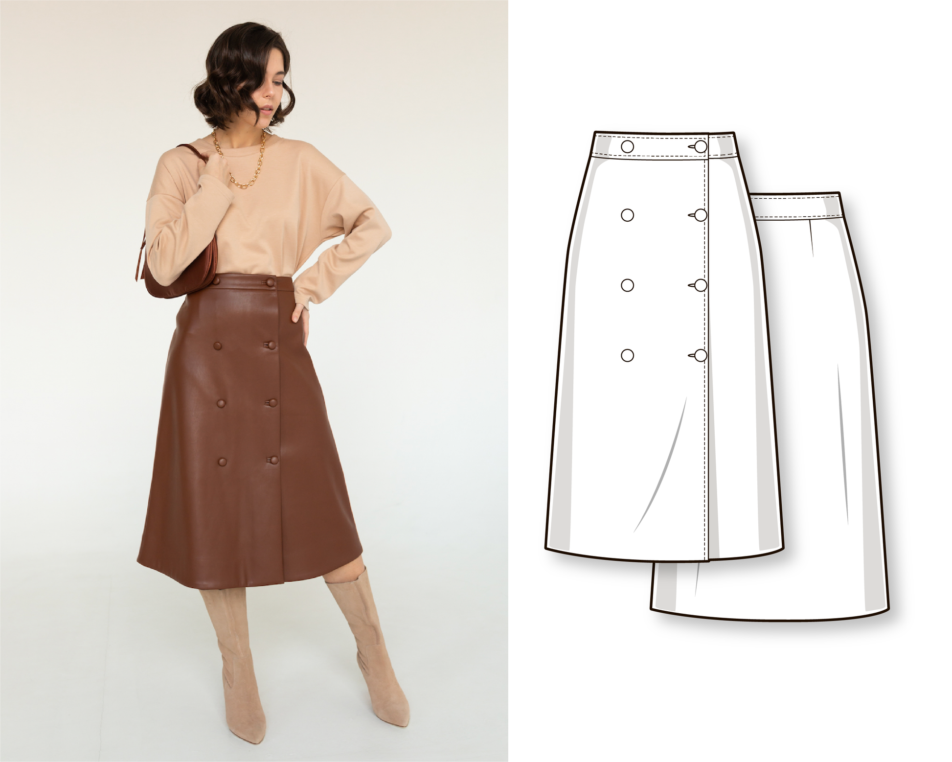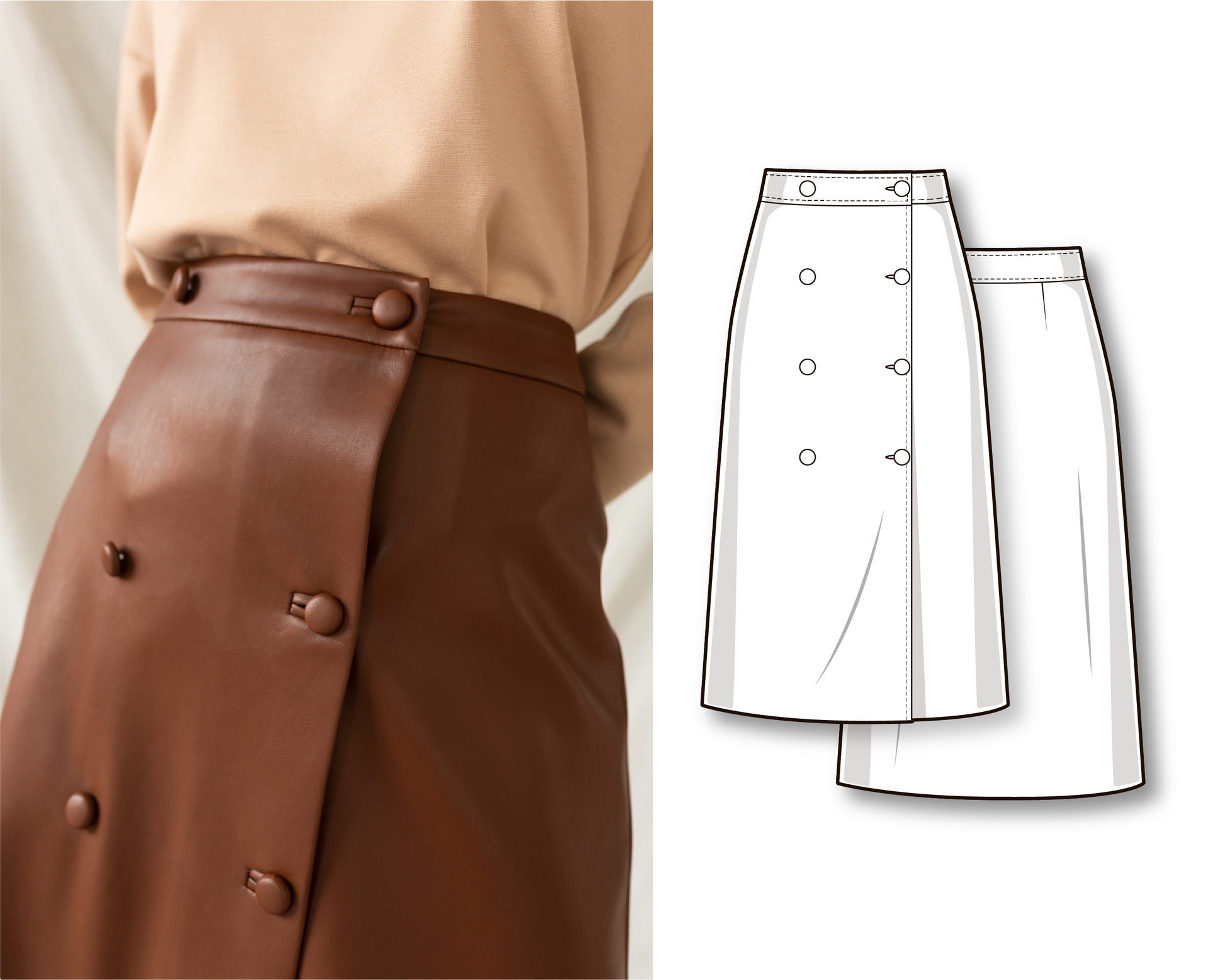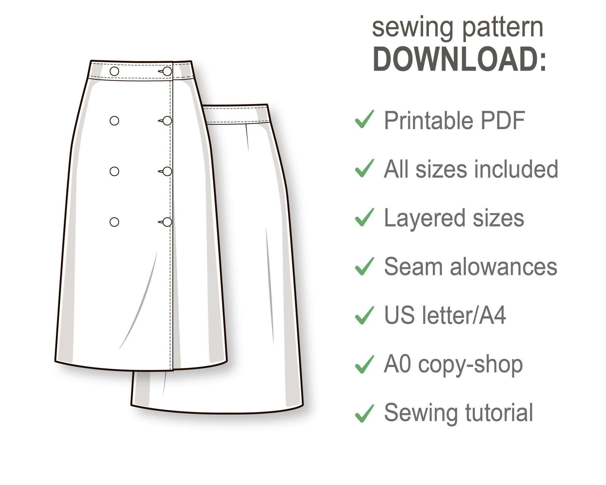 PDF sewing pattern of the women's a-line wrap midi skirt with buttons.