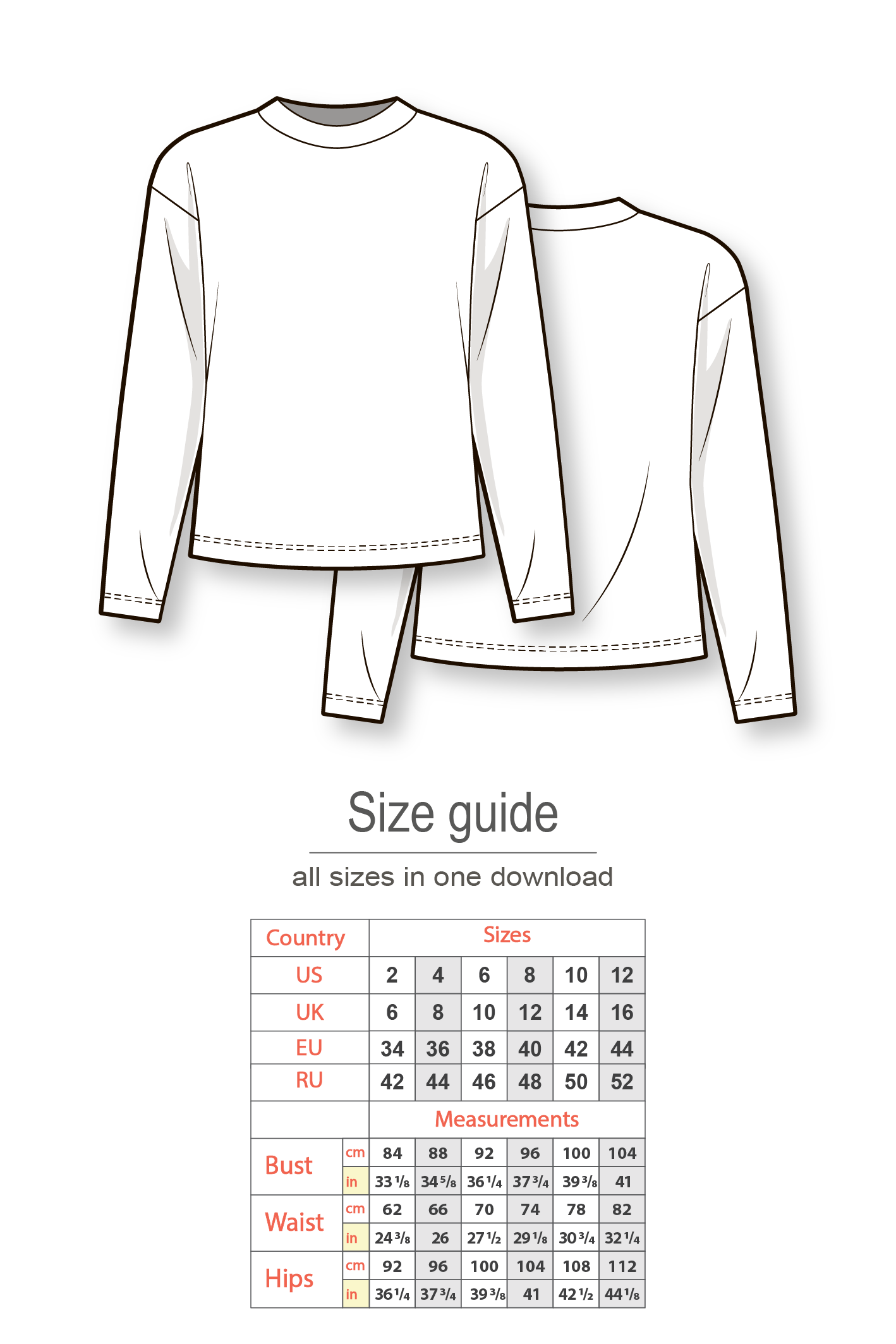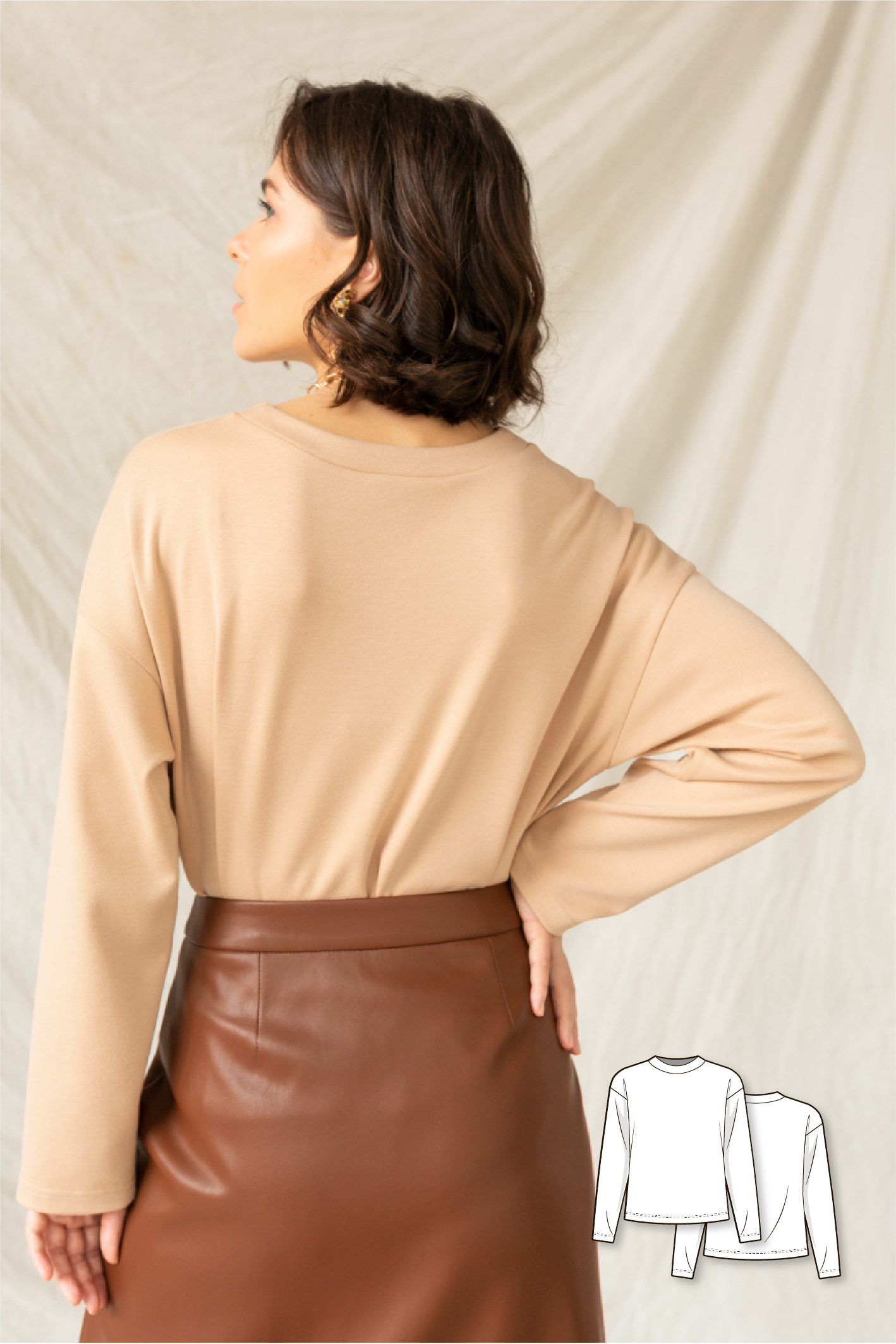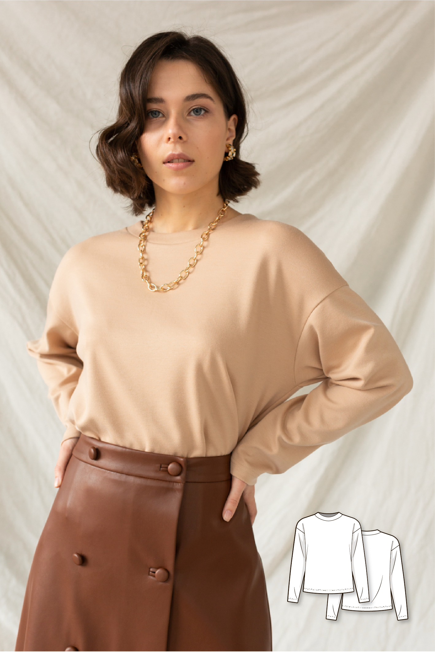 PDF sewing pattern of easy to sew drop shoulder knit sweatshirt with long sleeve and round neckline.