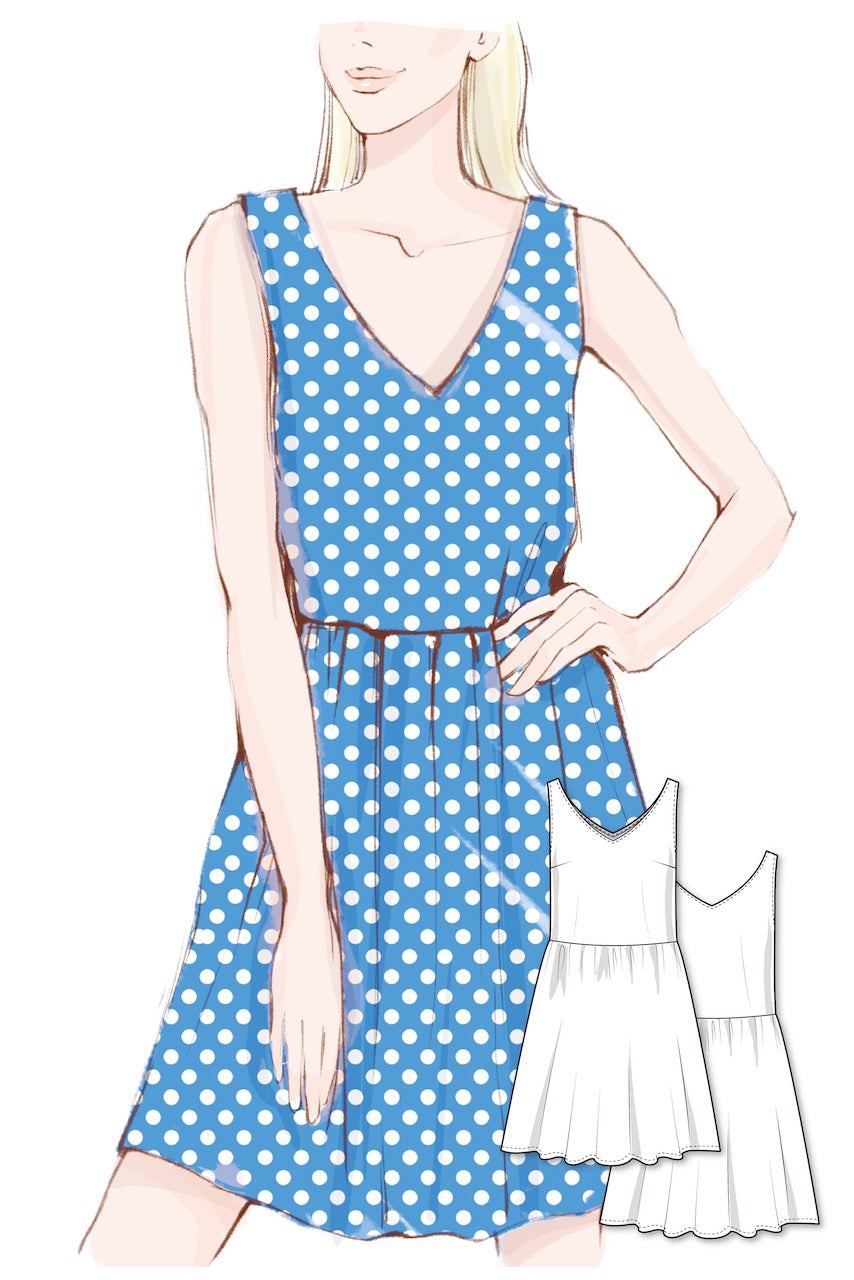 PDF sewing pattern of the women's tank top dress with gathered knee length skirt and V-shape neckline.
