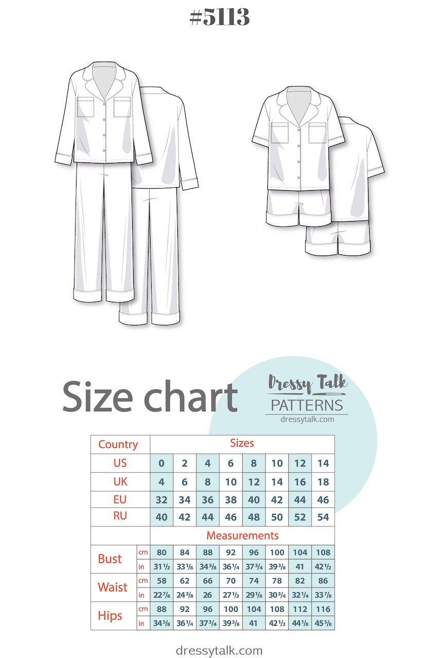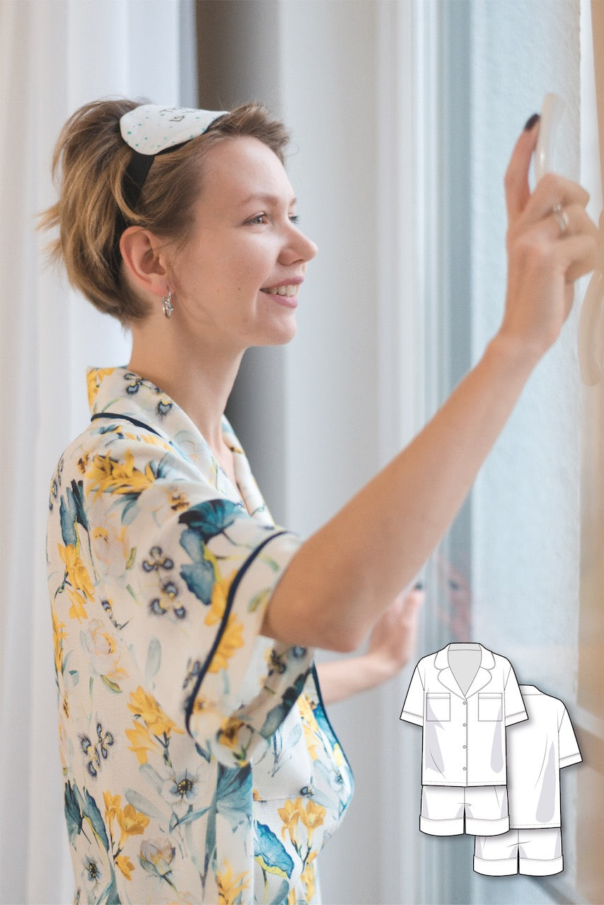 PDF sewing pattern of women's pajamas with classic pajama long/short sleeve shirt and pants/shorts (all option are available in one download).