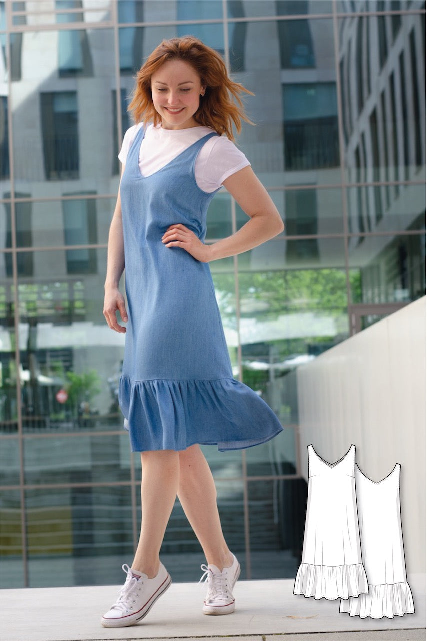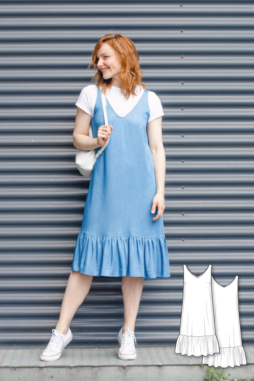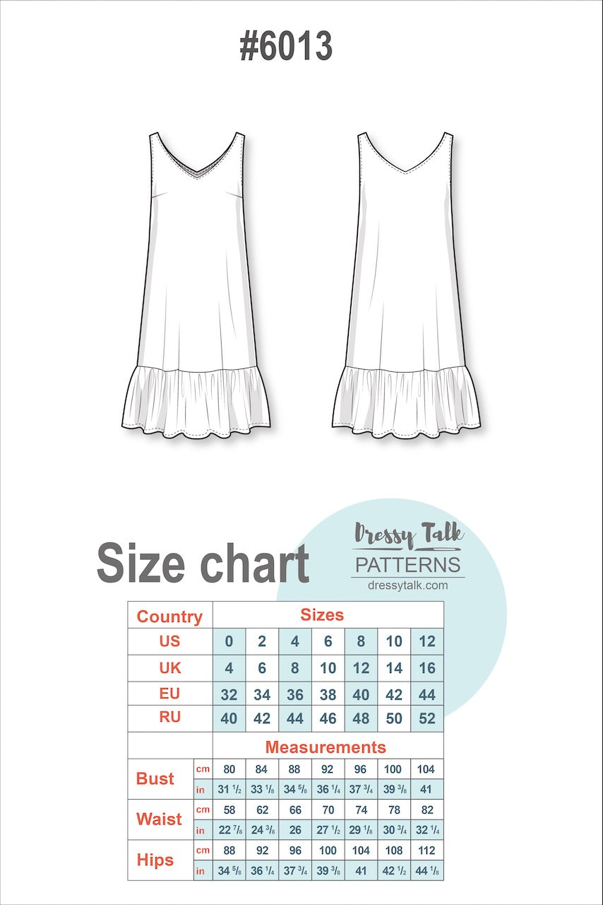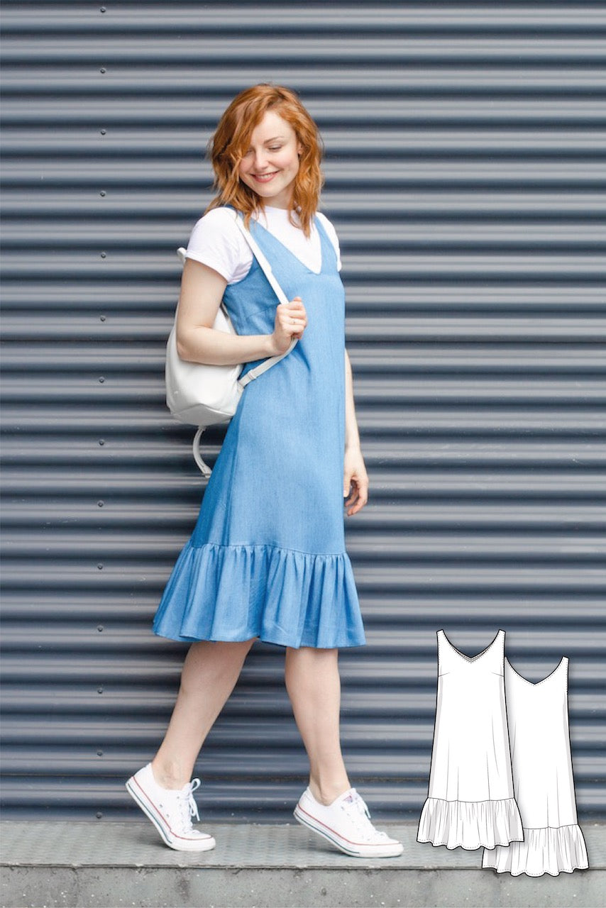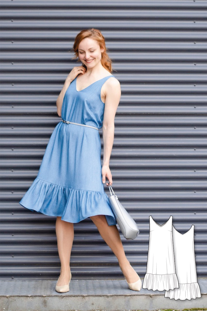 PDF sewing pattern of the women's sleeveless summer woven dress with ruffled hem and V-shape neckline.