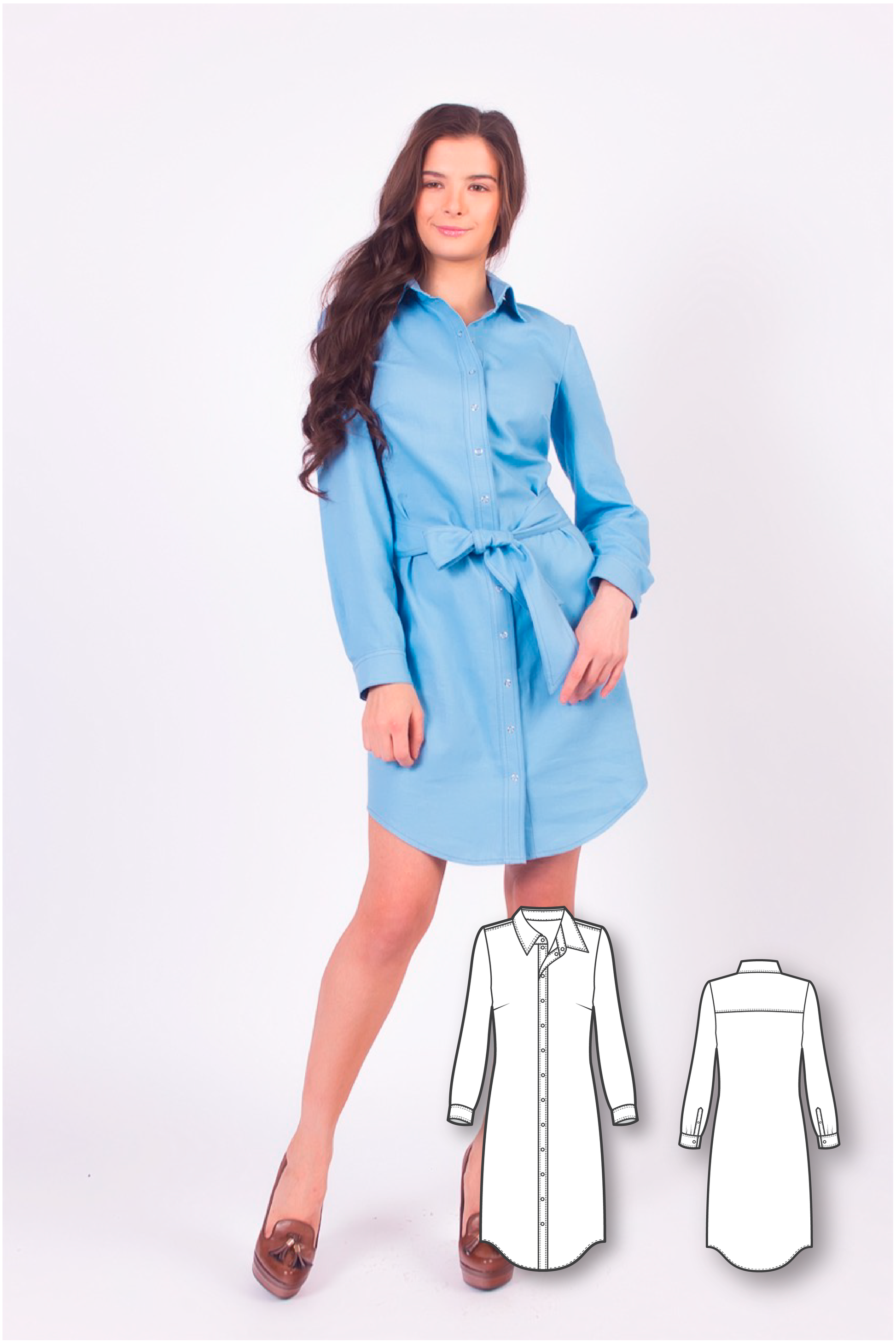 PDF sewing pattern of the classic button-up shirt dress with long sleeves, back yoke, and curved hem.