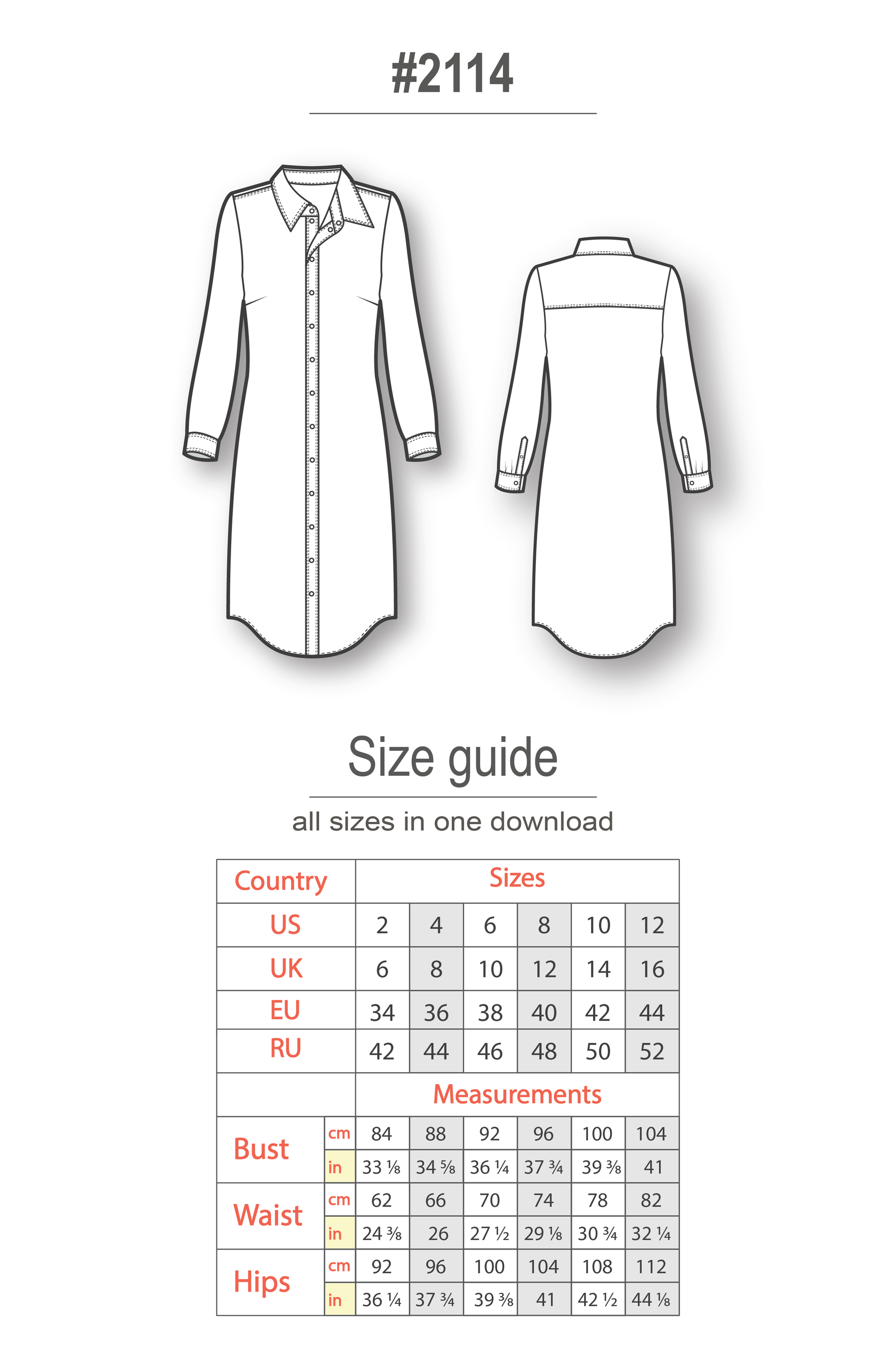Find the size chart in the the product images. This sewing pattern size range fits to: