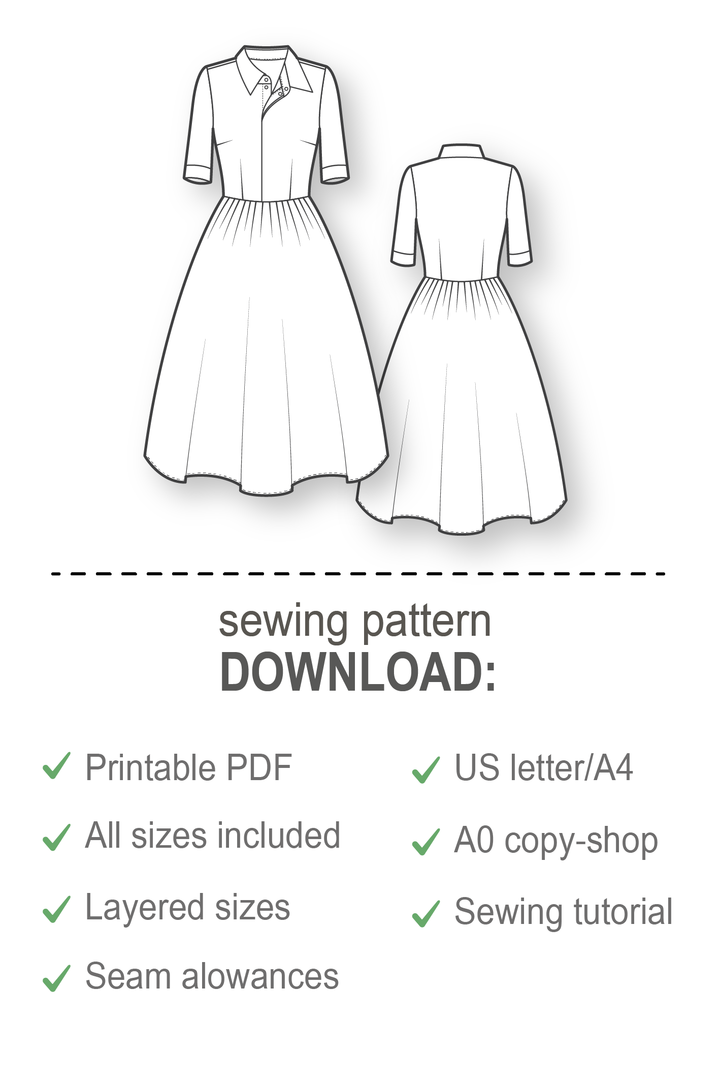 - Layered PDF sewing pattern for all sizes and heights