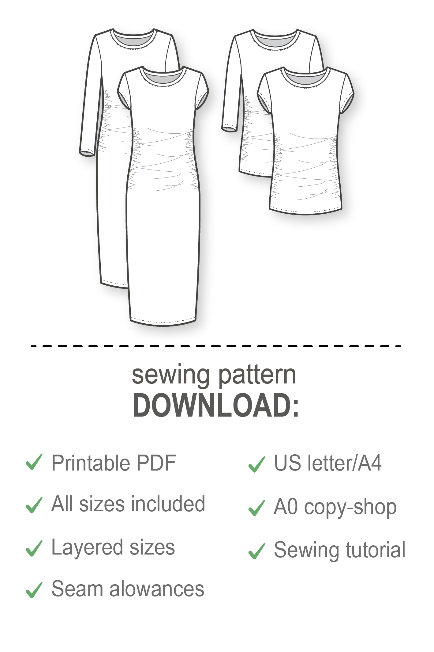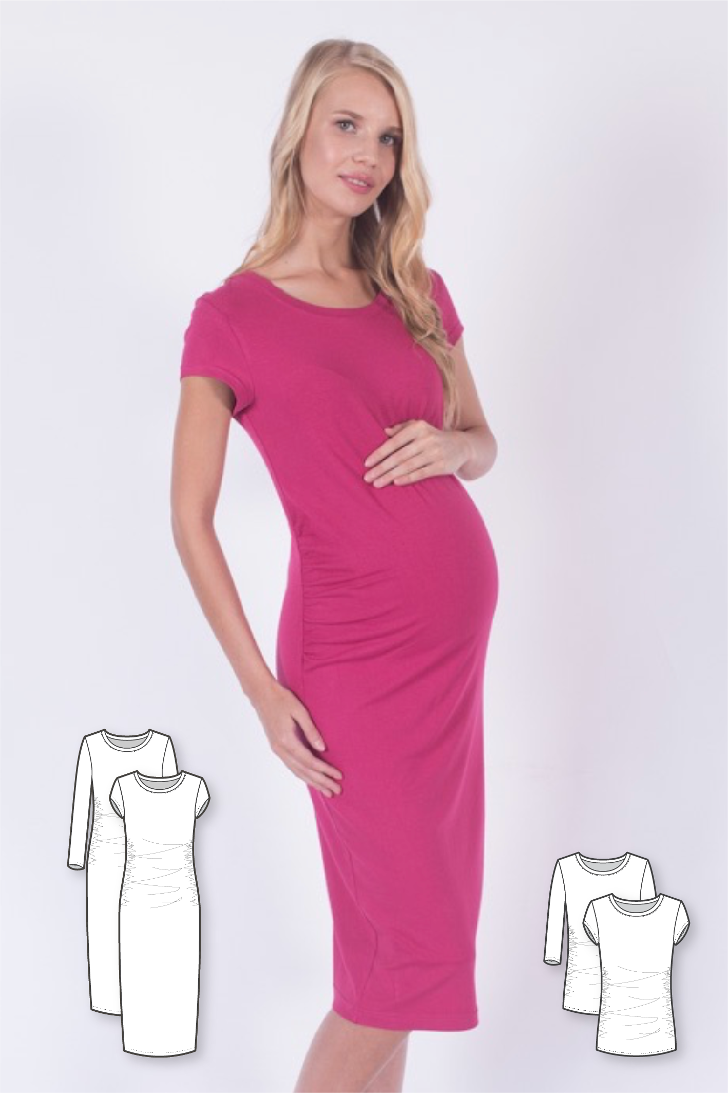 PDF sewing pattern of the maternity t-shirt dress PDF pattern with side seam gatherings in a belly area (fits till the end of the pregnancy). This pattern include both options: a dress and a top. Each with 3 sleeve length options.