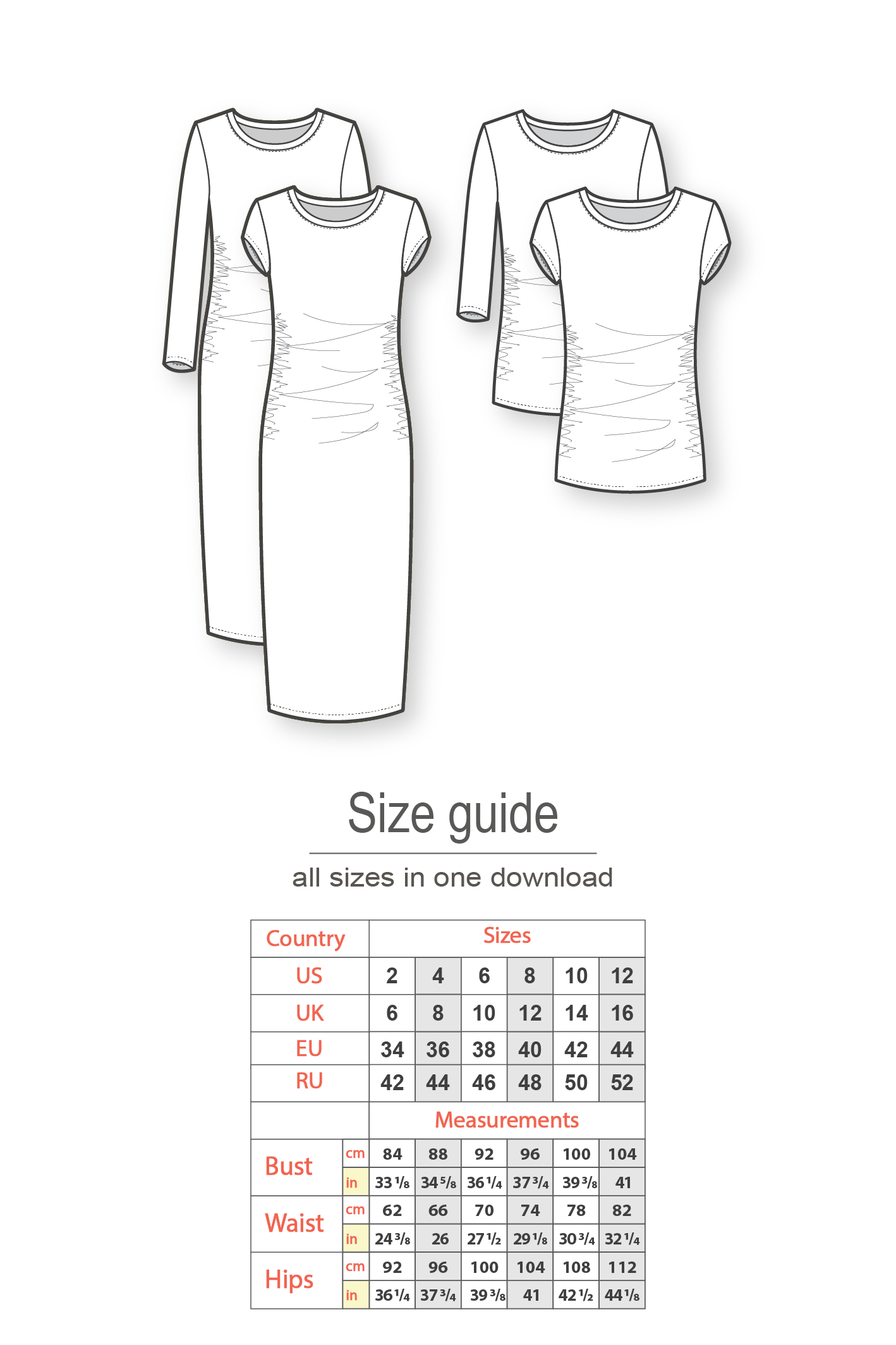 Find the size chart in the the product images. This sewing pattern size range fits to: