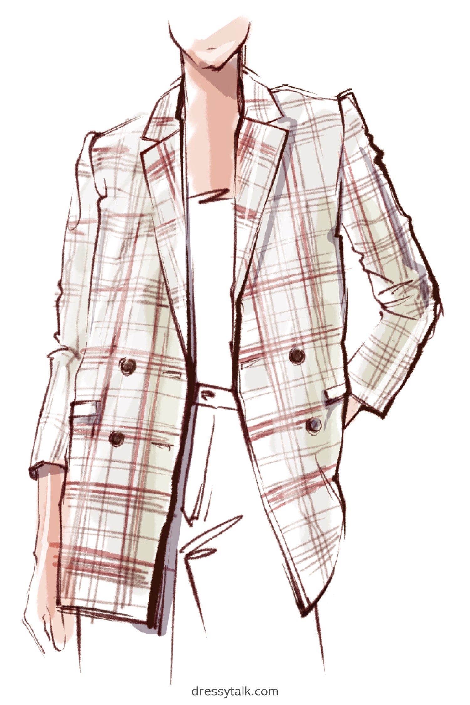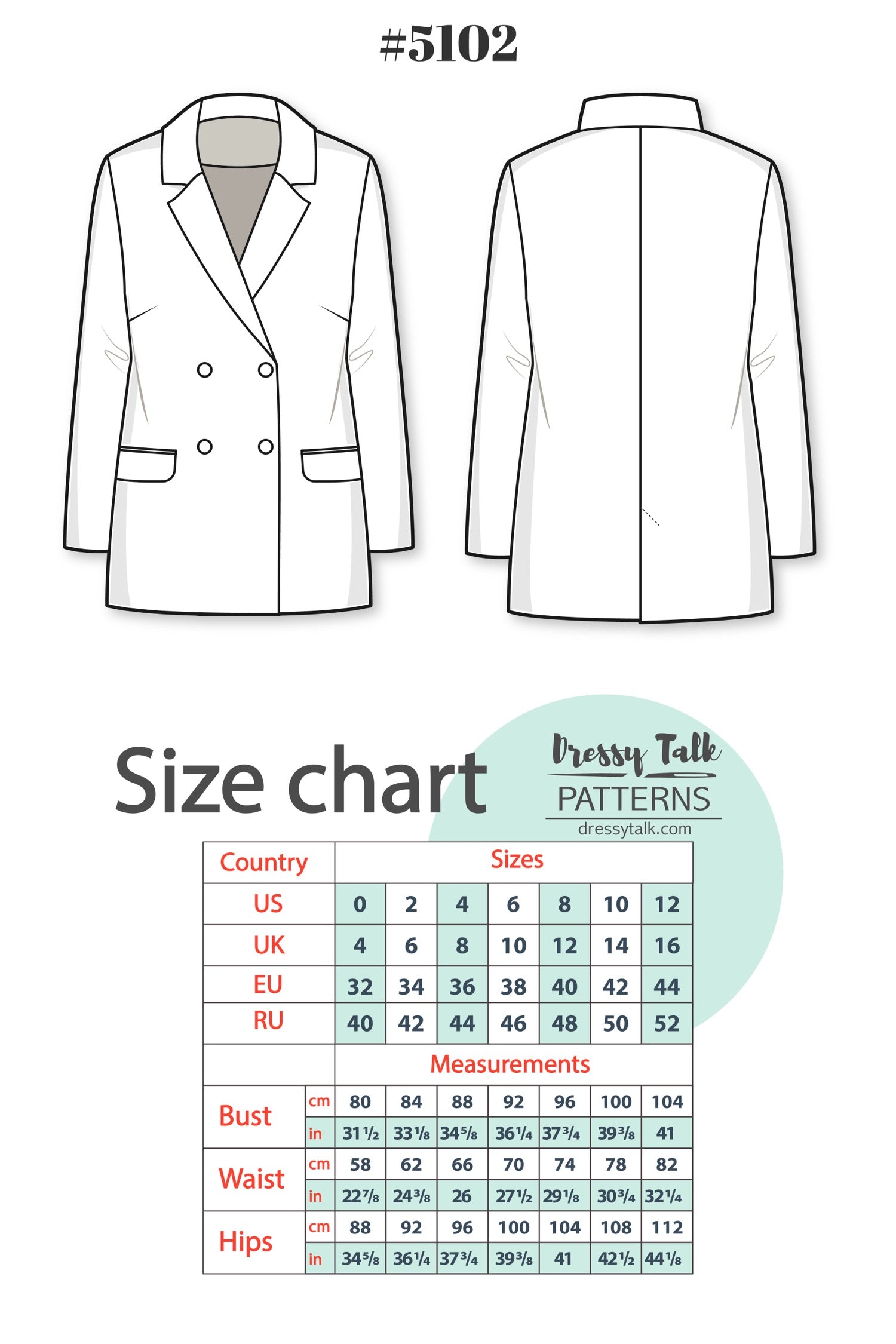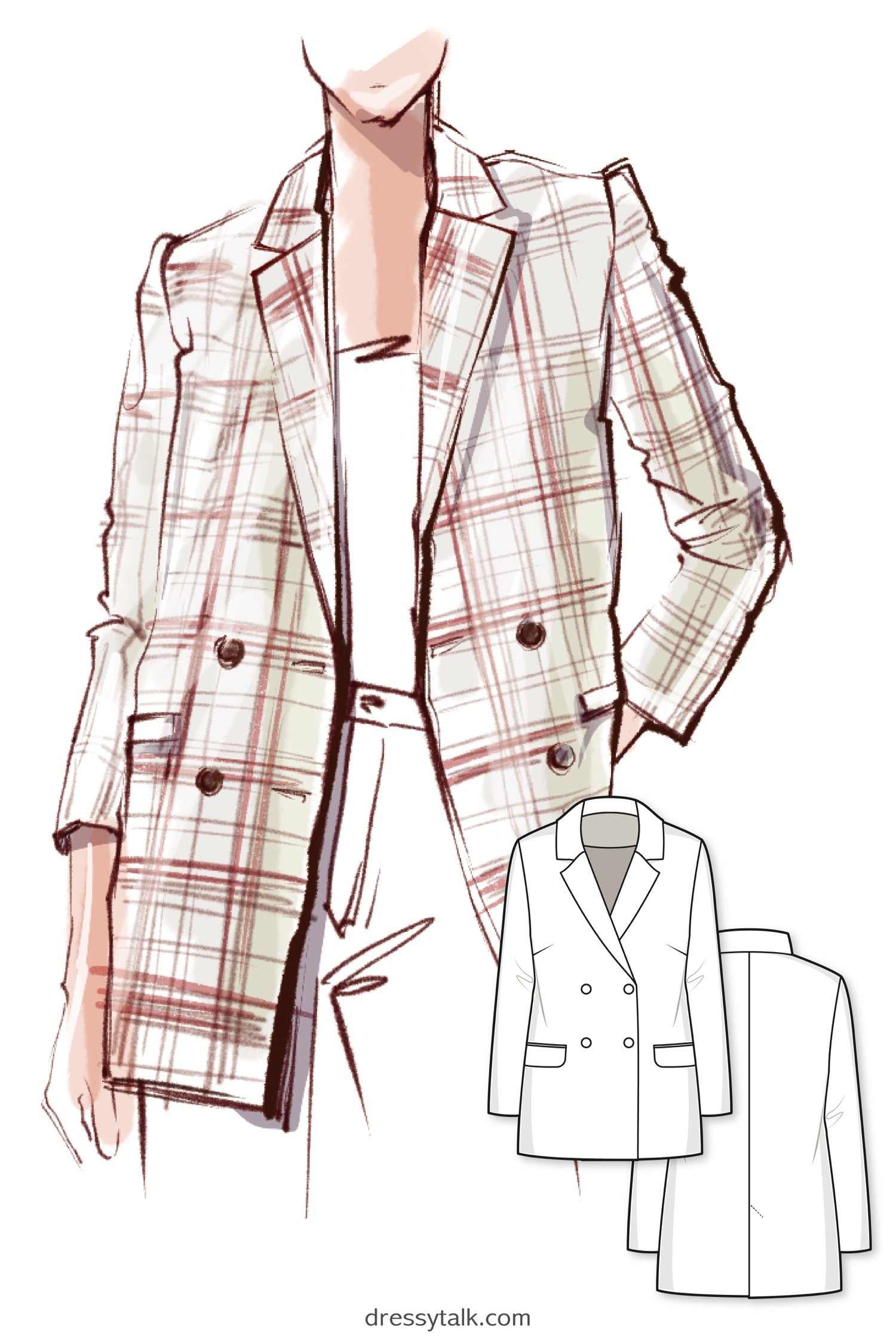 PDF sewing pattern of a classic women's double breasted lined blazer. The sewing pattern in all sizes and heights will be instantly available for download after purchasing.