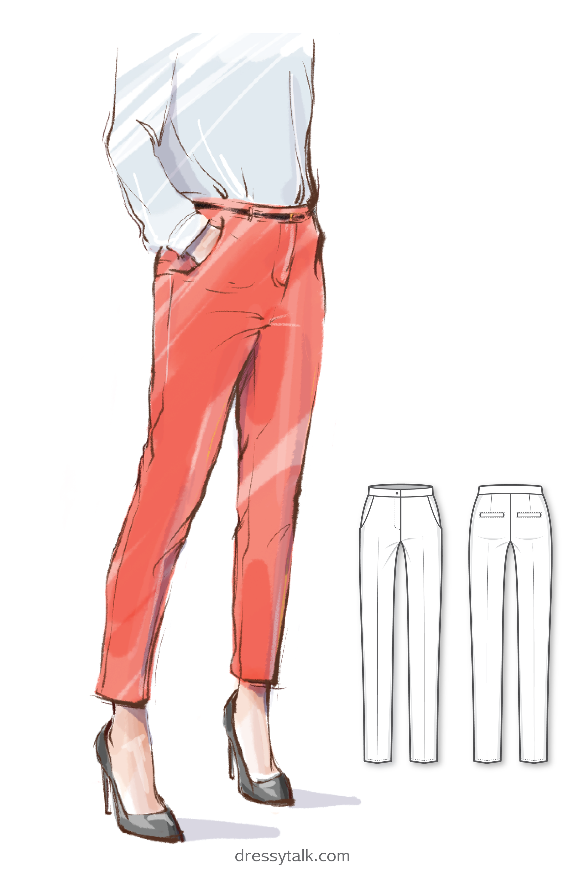 PDF sewing pattern of slim trousers with the central front fly and pockets. The sewing pattern in all sizes and heights will be instantly available for download after purchasing.